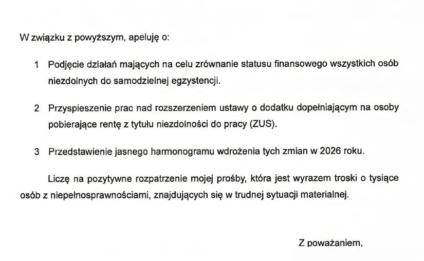 Jak przy każdej takiej petycji ministerstwo obszernie opisuje obowiązującą ustawę z 7 lipca 2023 r. o świadczeniu wspierającym, która weszła w życie 1 stycznia 2024 r., co buduje wrażenie, że to właśnie ten instrument ma w praktyce „zagospodarować” potrzeby wielu dorosłych osób z niepełnosprawnościami zamiast szybkiego wprowadzenia dodatku dopełniającego dla rencistów z niezdolnością do pracy.