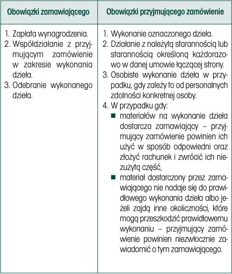 O należytym wykonaniu umowy o dzieło należy mówić jedynie w przypadku, gdy dzieło zostało wykonane w uzgodnionym terminie i w uzgodniony z zamawiającym sposób, chyba że do jego niewykonania doszło wyłącznie z przyczyn leżących po stronie zamawiającego (np. na skutek niedostarczenia materiałów niezbędnych do jego wykonania). Za realizację umowy o dzieło odpowiedzialność bierze przyjmujący zamówienie, również wtedy gdy stosuje się do wskazówek zamawiającego dotyczących sposobu jego wykonania. Osoba przyjmująca zamówienie nie ma obowiązku osobistego wykonania dzieła, chyba że taki obowiązek nakłada na nią umowa. Jednak nawet gdy przyjmujący zamówienie angażuje do wykonania dzieła osobę trzecią, cały czas ponosi odpowiedzialność za wykonanie i jakość dzieła wobec zamawiającego. Obowiązki stron umowy o dzieło przedstawia tabela 1.