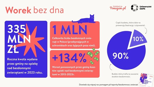 Polskie gminy wydają na bezdomność zwierząt 335 mln zł rocznie. Mimo wzrostu kosztów o 134% w ostatniej dekadzie, problem nie zmniejsza się. Nowy raport Fundacji Pomagam.pl obnaża systemową niegospodarność, zawiera opinie ekspertów, sprawdzone rozwiązania oraz rekomendacje zmian.