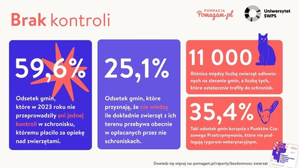 Sytuację pogarsza brak kontroli. Prawie 60% gmin w 2023 r. nie przeprowadziło wizytacji w schronisku, któremu przekazało zwierzęta, a co czwarta gmina przyznaje, że nie posiada informacji, ile zwierząt z jej terenu przebywa obecnie w opłacanych przez nią placówkach.