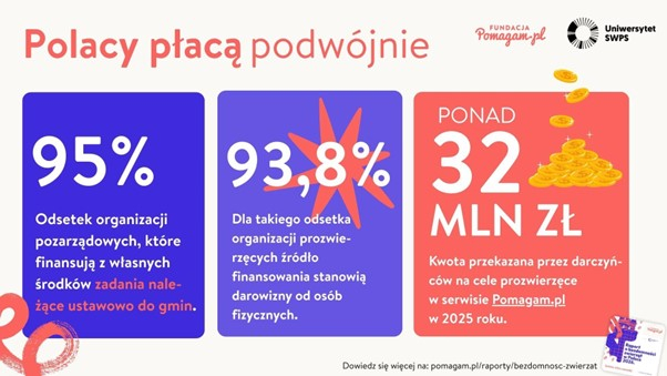 - 95% organizacji prozwierzęcych finansuje opiekę z prywatnych środków. Tylko na Pomagam.pl w 2025 r. zebrano na zwierzęta ponad 32 mln zł.